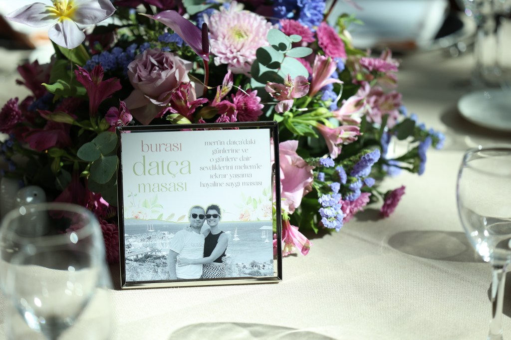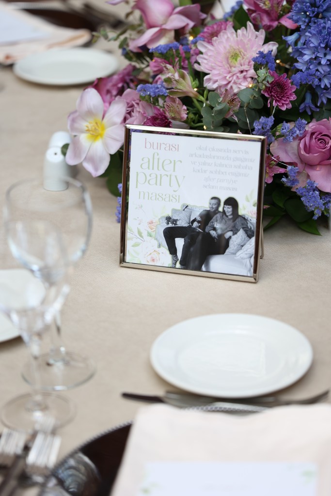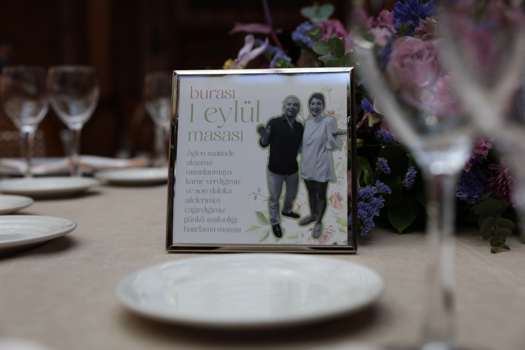 Masalara 1-2-3 diye sıradan numaralar vermek benim içime sinmiyordu. Bir şekilde hikâyeleştirmek istiyordum onları. Bizim için önemli sayıları kullanmaya karar vermiştik ilk; Mert ayın 21’inde evlenme teklifi ettiği için 21, 52 numaralı serviste tanıştığımız için 52 gibi… Ama sonra can arkadaşım Nazlı’yla 10 tane anlamlı sayı bulmanın kolay olmadığını, bazılarının zorlama olabileceğini konuştuk. Ve Nazlı, “Neden sayı yerine direkt kelime yapmıyorsunuz? Zaten fazla masa yok, insanlar bulmakta da zorlanmaz,” dedi. Bu şahane fikir çok içimize sindi ve bizim için anlamlı olan sözcükleri masa isimlerine çevirip kartlara hikâyelerini yazdık. Bu, düğünümüzü kişiselleştirmenin en tatlı yollarından biriydi bizce.